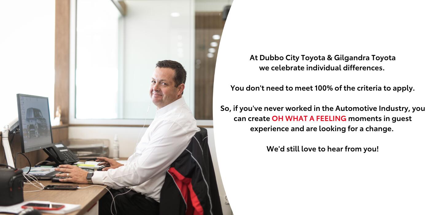 At Dubbo City Toyota we celebrate individual differences. You don't need to meet 100% of the criteria to apply. So, if you've never worked for Toyota, you can create OH WHAT A FEELING moments and are looking for a change. We'd still love to hear from you!